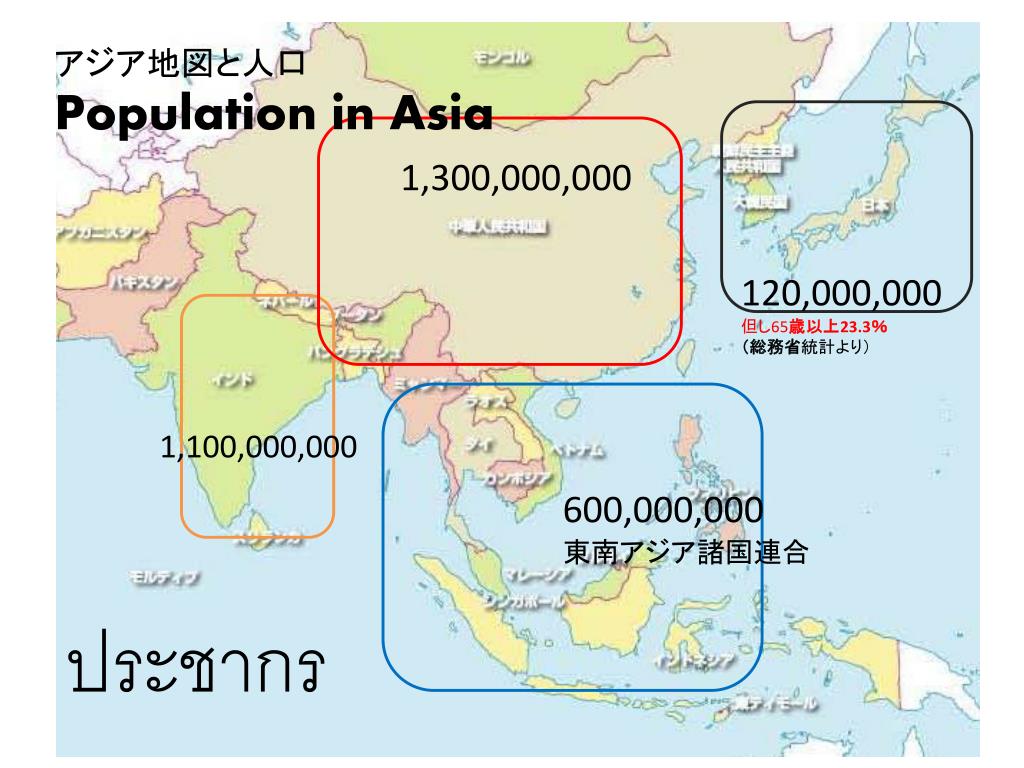 アジア地図と人口 Population in Asia 1,300,000,000 120,000,000 但し65歳以上23.3% (総務省統計より) 1,100,000,000 600,000,000 東南アジア諸国連合 ประชากร