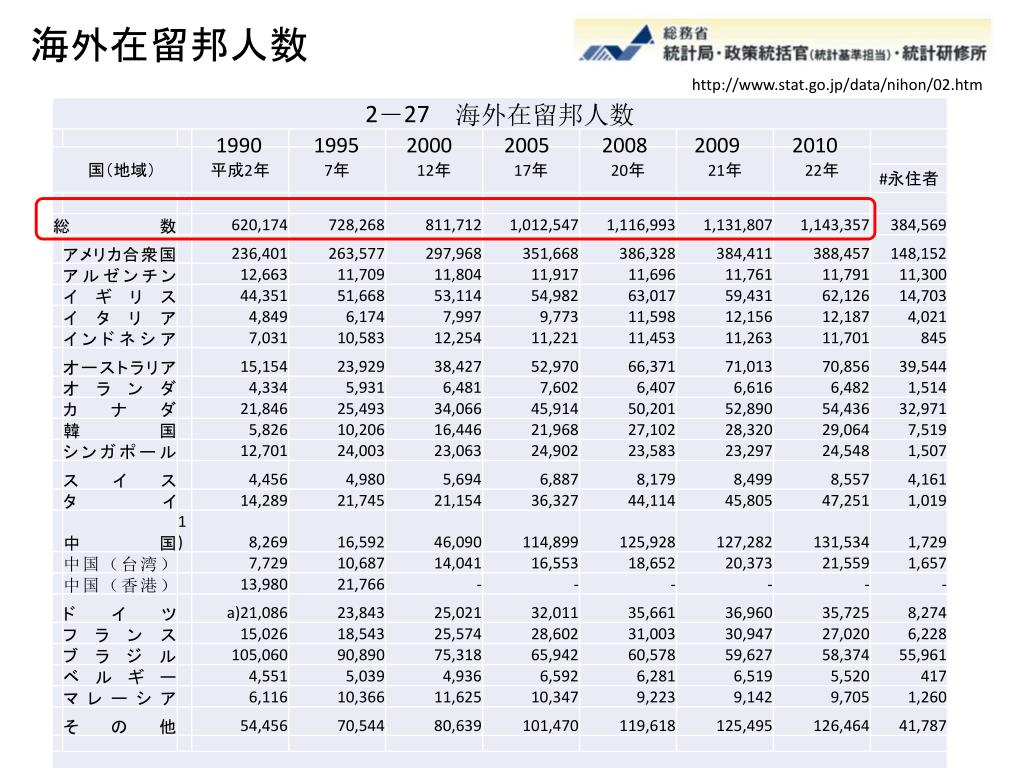 海外在留邦人数 http://www.stat.go.jp/data/nihon/02.htm 19952000 2005 2008 2009 2010