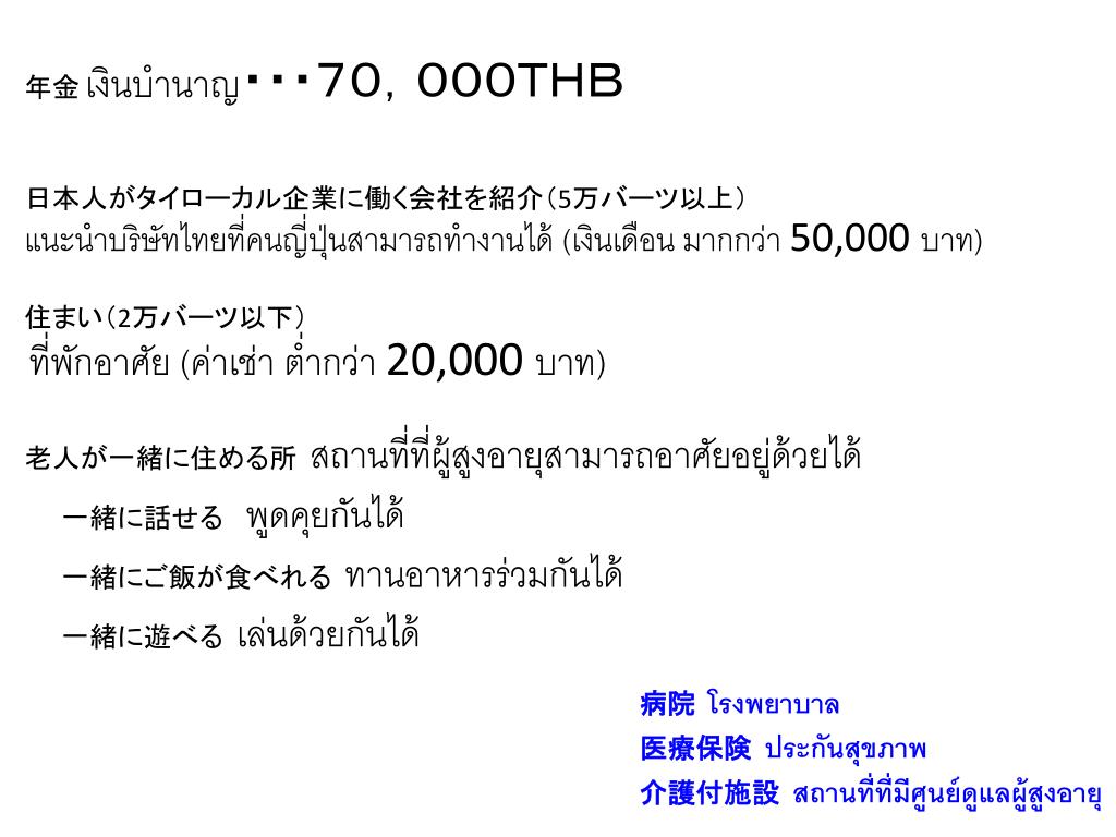 年金เงินบำนาญ・・・70,000THB年金เงินบำนาญ・・・70,000THB 日本人がタイローカル企業に働く会社を紹介(5万バーツ以上) แนะนำบริษัทไทยที่คนญี่ปุ่นสามารถทำงานได้ (เงินเดือน มากกว่า 50,000 บาท) 住まい(2万バーツ以下) ที่พักอาศัย (ค่าเช่า ต่ำกว่า 20,000 บาท) 老人が一緒に住める所สถานที่ที่ผู้สูงอายุสามารถอาศัยอยู่ด้วยได้ 一緒に話せるพูดคุยกันได้ 一緒にご飯が食べれるทานอาหารร่วมกันได้ 一緒に遊べるเล่นด้วยกันได้ 病院โรงพยาบาล 医療保険ประกันสุขภาพ 介護付施設สถานที่ที่มีศูนย์ดูแลผู้สูงอายุ