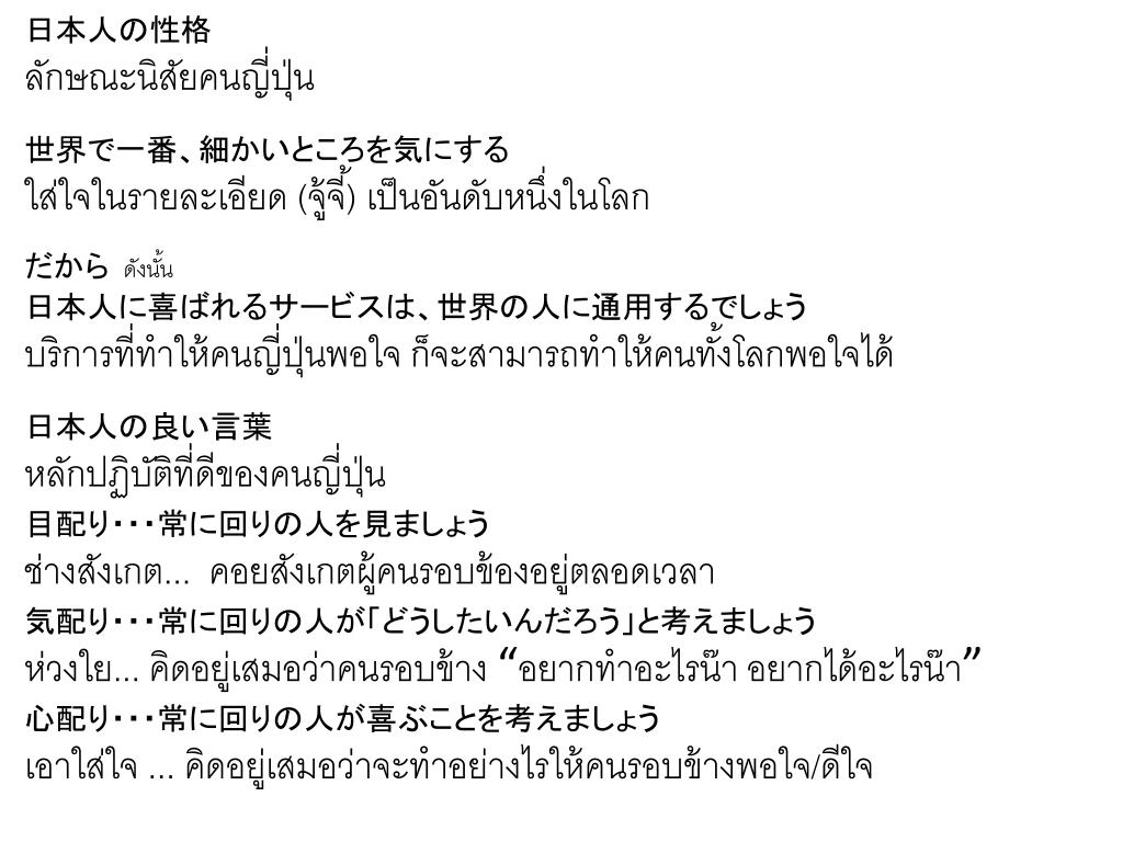 日本人の性格 ลักษณะนิสัยคนญี่ปุ่น 世界で一番、細かいところを気にする ใส่ใจในรายละเอียด (จู้จี้) เป็นอันดับหนึ่งในโลก だからดังนั้น 日本人に喜ばれるサービスは、世界の人に通用するでしょう บริการที่ทำให้คนญี่ปุ่นพอใจ ก็จะสามารถทำให้คนทั้งโลกพอใจได้ 日本人の良い言葉 หลักปฏิบัติที่ดีของคนญี่ปุ่น 目配り・・・常に回りの人を見ましょう ช่างสังเกต... คอยสังเกตผู้คนรอบข้องอยู่ตลอดเวลา 気配り・・・常に回りの人が「どうしたいんだろう」と考えましょう ห่วงใย... คิดอยู่เสมอว่าคนรอบข้าง “อยากทำอะไรน๊า อยากได้อะไรน๊า” 心配り・・・常に回りの人が喜ぶことを考えましょう เอาใส่ใจ ... คิดอยู่เสมอว่าจะทำอย่างไรให้คนรอบข้างพอใจ/ดีใจ