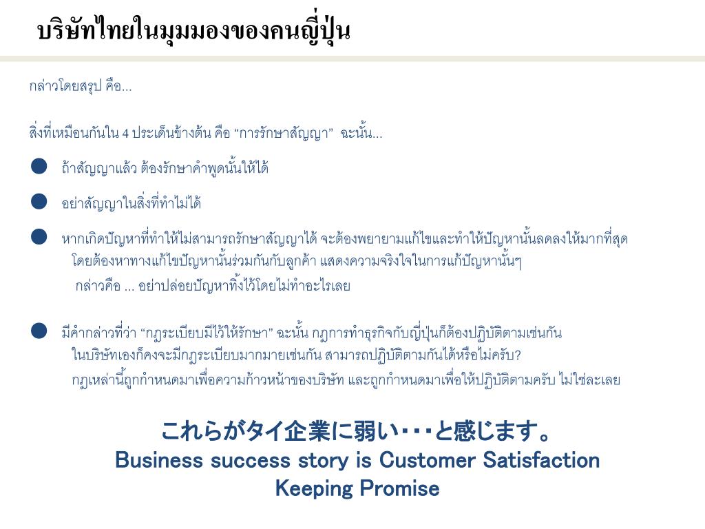 บริษัทไทยในมุมมองของคนญี่ปุ่นบริษัทไทยในมุมมองของคนญี่ปุ่น กล่าวโดยสรุป คือ... สิ่งที่เหมือนกันใน 4 ประเด็นข้างต้น คือ “การรักษาสัญญา” ฉะนั้น... ● ถ้าสัญญาแล้ว ต้องรักษาคำพูดนั้นให้ได้ ● อย่าสัญญาในสิ่งที่ทำไม่ได้ ● หากเกิดปัญหาที่ทำให้ไม่สามารถรักษาสัญญาได้ จะต้องพยายามแก้ไขและทำให้ปัญหานั้นลดลงให้มากที่สุด โดยต้องหาทางแก้ไขปัญหานั้นร่วมกันกับลูกค้า แสดงความจริงใจในการแก้ปัญหานั้นๆ กล่าวคือ ... อย่าปล่อยปัญหาทิ้งไว้โดยไม่ทำอะไรเลย ● มีคำกล่าวที่ว่า “กฎระเบียบมีไว้ให้รักษา” ฉะนั้น กฎการทำธุรกิจกับญี่ปุ่นก็ต้องปฏิบัติตามเช่นกัน ในบริษัทเองก็คงจะมีกฎระเบียบมากมายเช่นกัน สามารถปฏิบัติตามกันได้หรือไม่ครับ? กฎเหล่านี้ถูกกำหนดมาเพื่อความก้าวหน้าของบริษัท และถูกกำหนดมาเพื่อให้ปฏิบัติตามครับ ไม่ใช่ละเลย これらがタイ企業に弱い・・・と感じます。 Business success story is Customer Satisfaction Keeping Promise