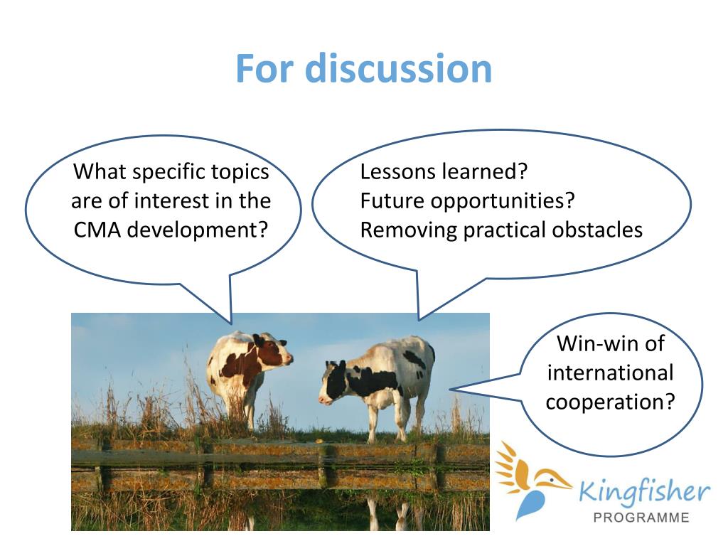 For discussion What specific topics are of interest in the CMA development? Lessons learned? Future opportunities? Removing practical obstacles Win-win of international cooperation?