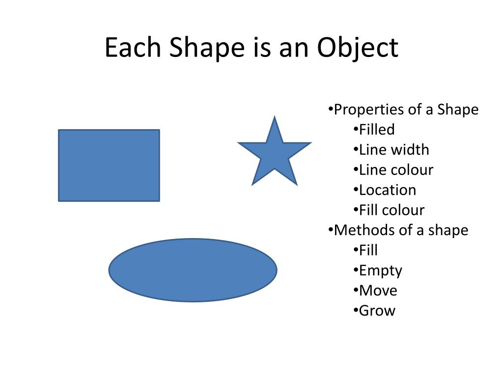 Each Shape is an Object • Properties of a Shape • Filled • Line width • Line colour • Location • Fill colour • Methods of a shape • Fill • Empty • Move • Grow