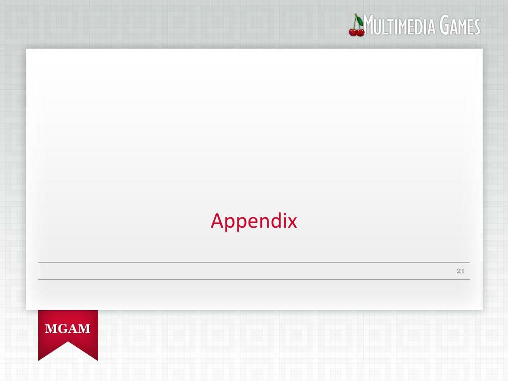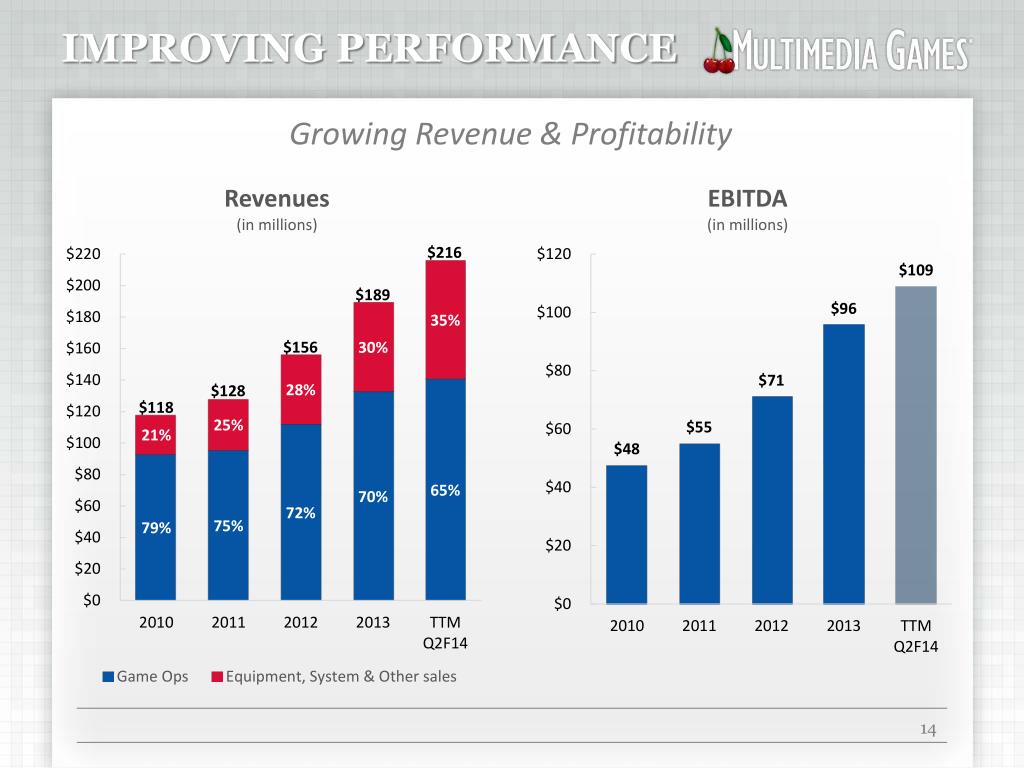 Multimedia Gamesat a Glance • Austin, Texas-based developer and provider of gaming devices and gaming systems • Q2F14 TTM revenues of over $215 million • Up 25% Y/Y • 65% of revenue fromparticipation or recurringrevenue agreements • 35% from game sales • Broad product acceptance • Peer-leading Q2F14 TTM EBITDA margins of 50% • Peer-leading Q2F14 TTM operating margins of approximately 28%