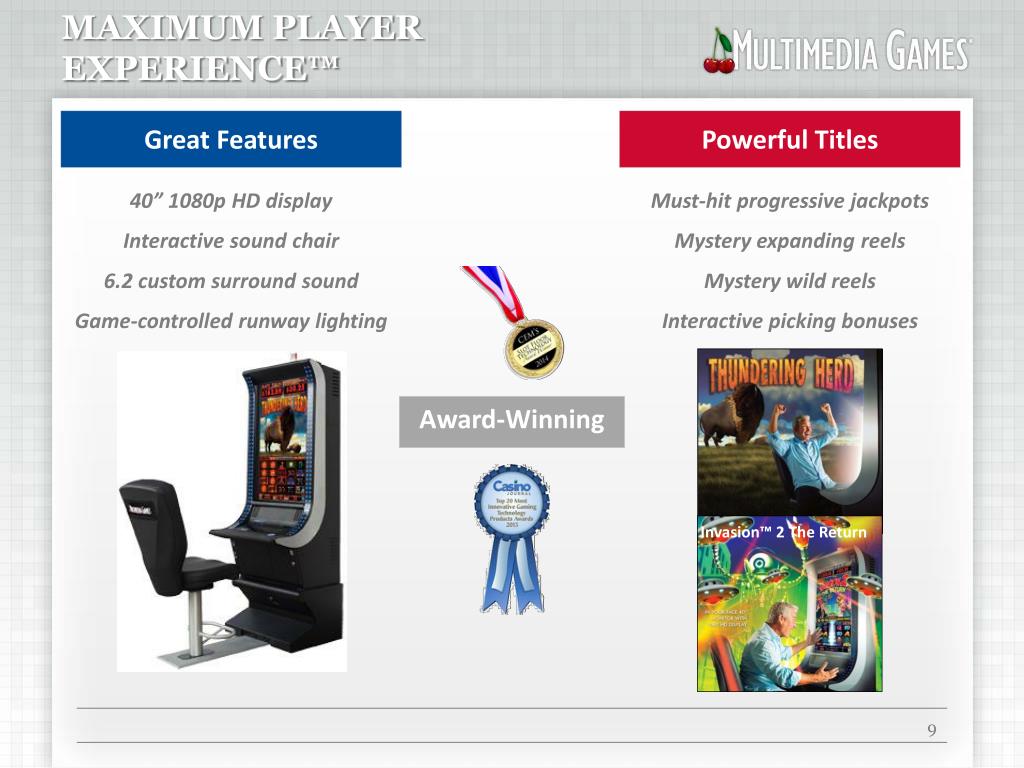 Maximum Player Experience™ Powerful Titles Great Features • 40” 1080p HD display • Interactive sound chair • 6.2 custom surround sound • Game-controlled runway lighting • Must-hit progressive jackpots • Mystery expanding reels • Mystery wild reels • Interactive picking bonuses Award-Winning Invasion™ 2 The Return