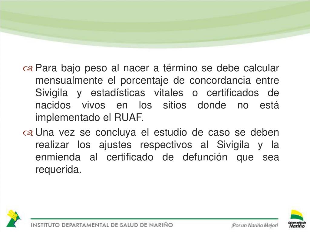Para bajo peso al nacer a término se debe calcular mensualmente el porcentaje de concordancia entre Sivigila y estadísticas vitales o certificados de nacidos vivos en los sitios donde no está implementado el RUAF. Una vez se concluya el estudio de caso se deben realizar los ajustes respectivos al Sivigila y la enmienda al certificado de defunción que sea requerida.