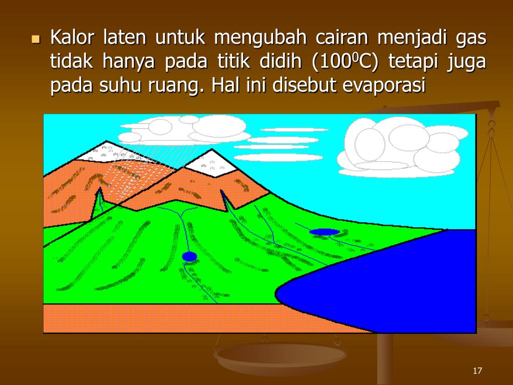 Kalor laten untuk mengubah cairan menjadi gas tidak hanya pada titik didih (1000C) tetapi juga pada suhu ruang. Hal ini disebut evaporasi