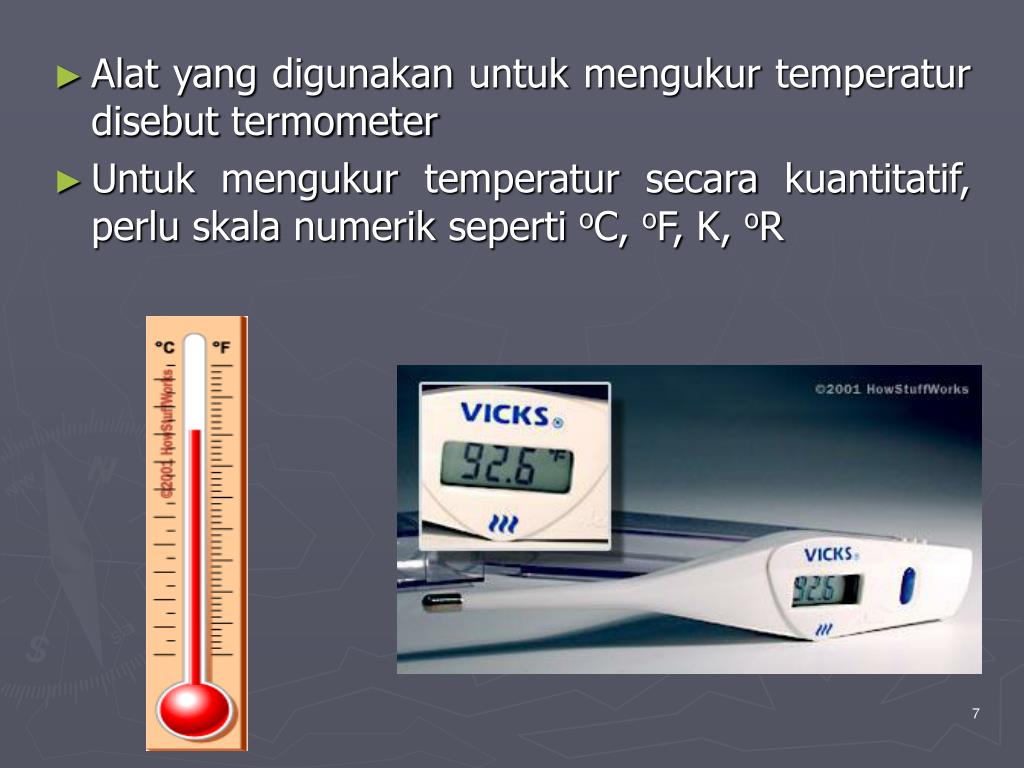 Alat yang digunakan untuk mengukur temperatur disebut termometer • Untuk mengukur temperatur secara kuantitatif, perlu skala numerik seperti oC, oF, K, oR