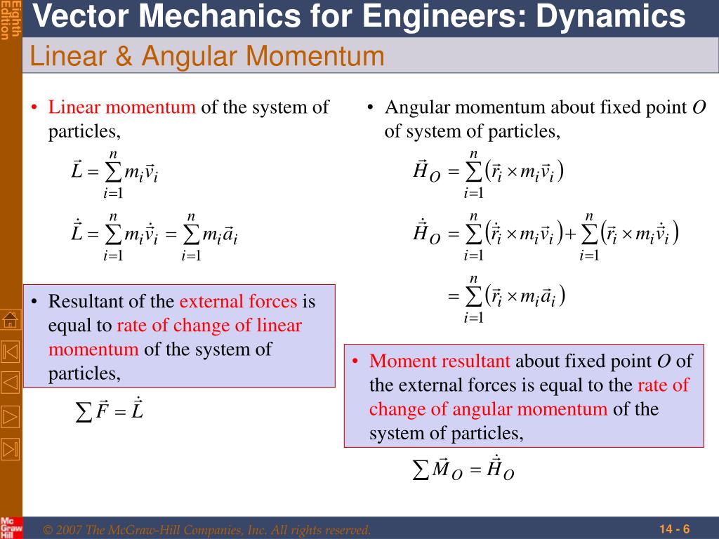 Linear momentum of the system of particles, • Angular momentum about fixed point O of system of particles, • Resultant of the external forces is equal to rate of change of linear momentum of the system of particles, • Momentresultant about fixed point O of the external forces is equal to the rate of change of angular momentum of the system of particles, Linear & Angular Momentum