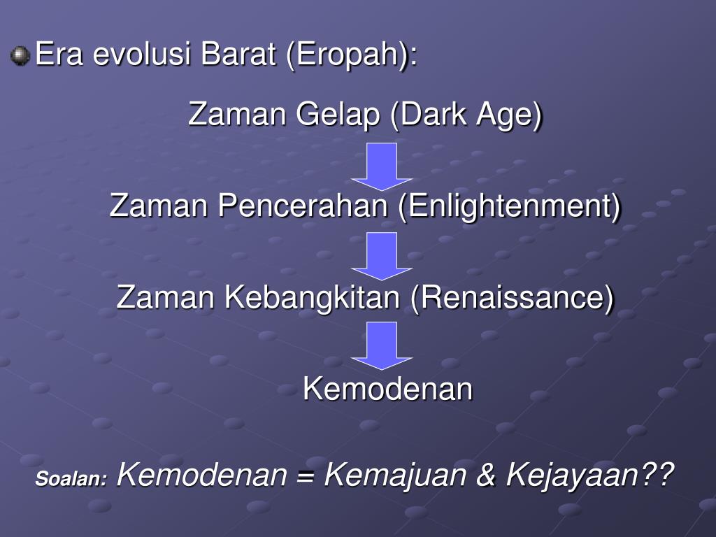 Era evolusi Barat (Eropah): Zaman Gelap (Dark Age) Zaman Pencerahan (Enlightenment) Zaman Kebangkitan (Renaissance) Kemodenan Soalan:Kemodenan = Kemajuan & Kejayaan??