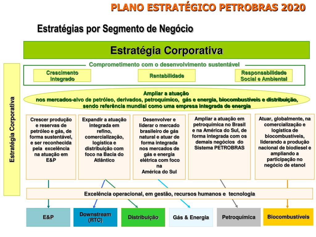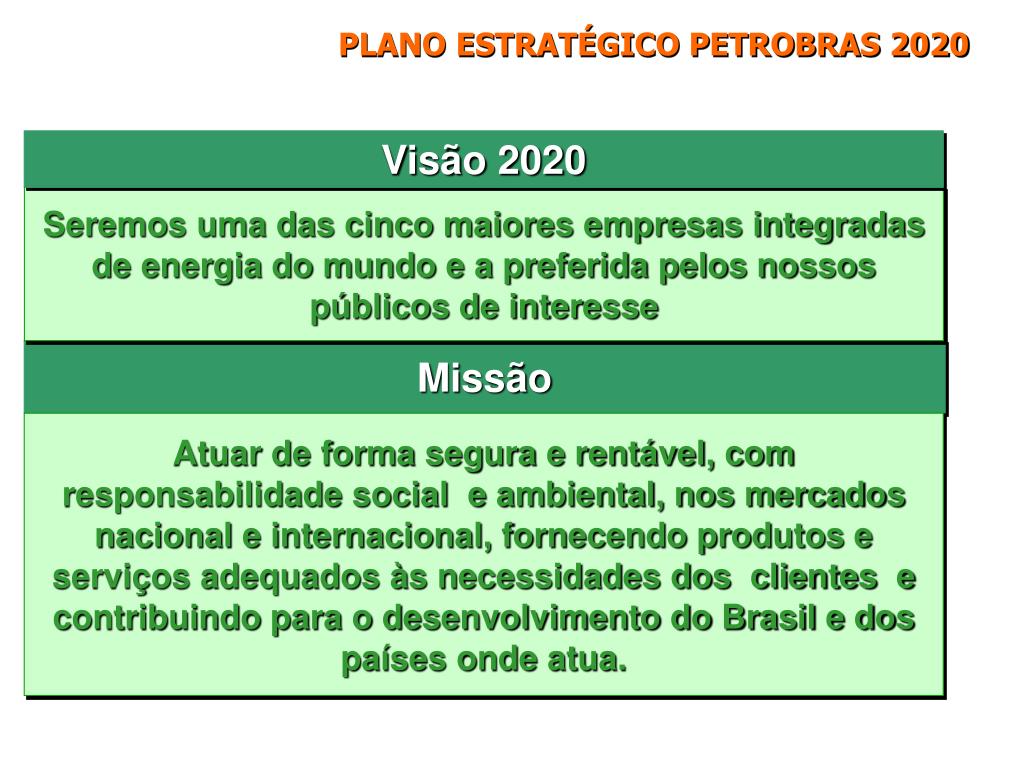 PLANO ESTRATÉGICO PETROBRAS 2020 Visão 2020 Seremos uma das cinco maiores empresas integradas de energia do mundo e a preferida pelos nossos públicos de interesse Missão Atuar de forma segura e rentável, com responsabilidade social e ambiental, nos mercados nacional e internacional, fornecendo produtos e serviços adequados às necessidades dos clientes e contribuindo para o desenvolvimento do Brasil e dos países onde atua.