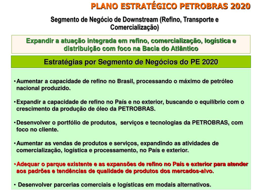 PLANO ESTRATÉGICO PETROBRAS 2020 Segmento de Negócio de Downstream (Refino, Transporte e Comercialização) Expandir a atuação integrada em refino, comercialização, logística e distribuição com foco na Bacia do Atlântico Estratégias por Segmento de Negócios do PE 2020 • Aumentar a capacidade de refino no Brasil, processando o máximo de petróleo nacional produzido. • Expandir a capacidade de refino no País e no exterior, buscando o equilíbrio com o crescimento da produção de óleo da PETROBRAS. • Desenvolver o portfólio de produtos, serviços e tecnologias da PETROBRAS, com foco no cliente. • Aumentar as vendas de produtos e serviços, expandindo as atividades de comercialização, logística e processamento, no País e exterior. • Adequar o parque existente e as expansões de refino no País e exterior para atender aos padrões e tendências de qualidade de produtos dos mercados-alvo. • Desenvolver parcerias comerciais e logísticas em modais alternativos.