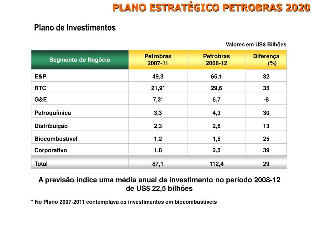 PLANO ESTRATÉGICO PETROBRAS 2020 Plano de Investimentos Valores em US$ Bilhões A previsão indica uma média anual de investimento no período 2008-12 de US$ 22,5 bilhões * No Plano 2007-2011 contemplava os investimentos em biocombustíveis