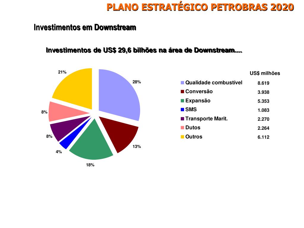 PLANO ESTRATÉGICO PETROBRAS 2020 Investimentos em Downstream Investimentos de US$ 29,6 bilhões na área de Downstream.... US$ milhões