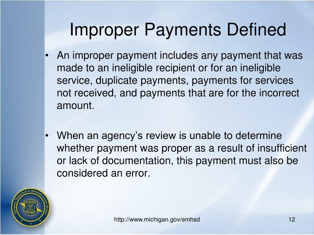 Improper Payments Defined • An improper payment includes any payment that was made to an ineligible recipient or for an ineligible service, duplicate payments, payments for services not received, and payments that are for the incorrect amount. • When an agency’s review is unable to determine whether payment was proper as a result of insufficient or lack of documentation, this payment must also be considered an error. http://www.michigan.gov/emhsd