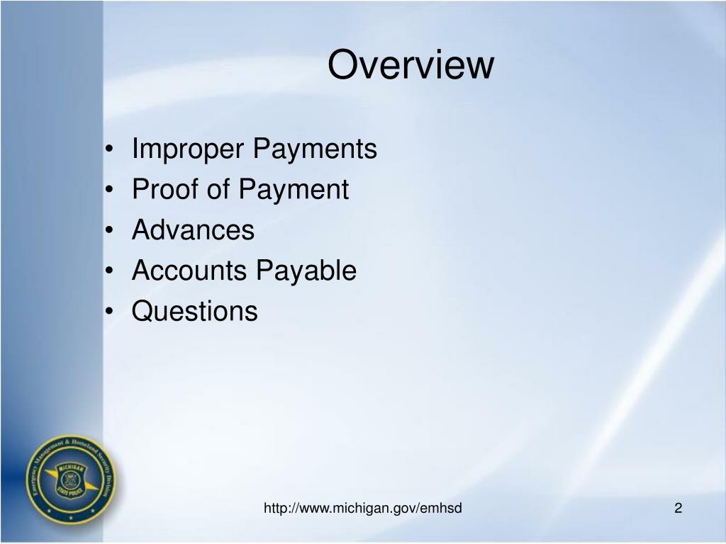 Overview • Improper Payments • Proof of Payment • Advances • Accounts Payable • Questions http://www.michigan.gov/emhsd