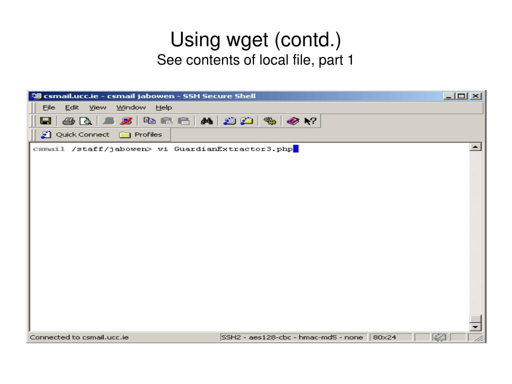 wget • wget is for non-interactive download of files from the Web. • It supports HTTP, HTTPS, and FTP protocols, as well as retrieval through HTTP proxies. • wget is non-interactive, meaning that it can work in the background, while the user is not logged on • This allows you to start a retrieval and disconnect from the system, letting Wget finish the work. • By contrast, most of web browsers require constant user's presence