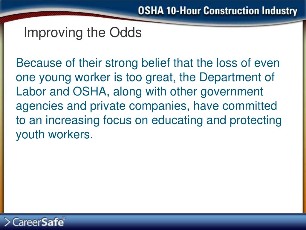 Improving the Odds Because of their strong belief that the loss of even one young worker is too great, the Department of Labor and OSHA, along with other government agencies and private companies, have committed to an increasing focus on educating and protecting youth workers.