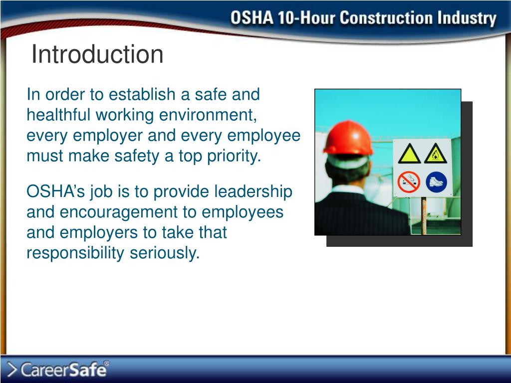 Introduction In order to establish a safe and healthful working environment, every employer and every employee must make safety a top priority. OSHA’s job is to provide leadership and encouragement to employees and employers to take that responsibility seriously.