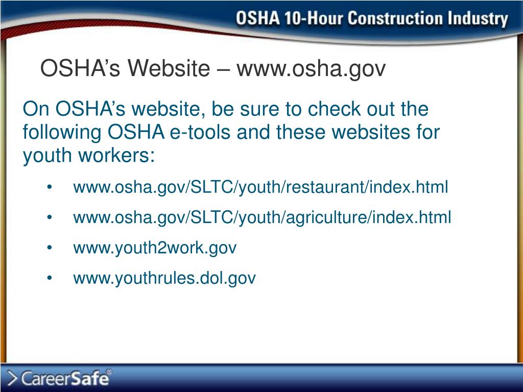 OSHA’s Website – www.osha.gov On OSHA’s website, be sure to check out the following OSHA e-tools and these websites for youth workers: • www.osha.gov/SLTC/youth/restaurant/index.html • www.osha.gov/SLTC/youth/agriculture/index.html • www.youth2work.gov • www.youthrules.dol.gov