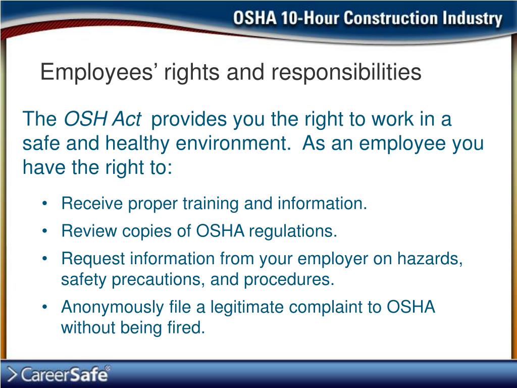 Employees’ rights and responsibilities The OSH Act provides you the right to work in a safe and healthy environment. As an employee you have the right to: • Receive proper training and information. • Review copies of OSHA regulations. • Request information from your employer on hazards, safety precautions, and procedures. • Anonymously file a legitimate complaint to OSHA without being fired.