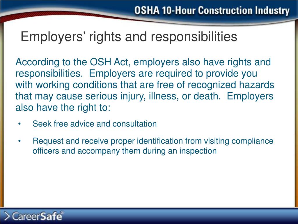 Employers’ rights and responsibilities According to the OSH Act, employers also have rights and responsibilities. Employers are required to provide you with working conditions that are free of recognized hazards that may cause serious injury, illness, or death. Employers also have the right to: • Seek free advice and consultation • Request and receive proper identification from visiting compliance officers and accompany them during an inspection