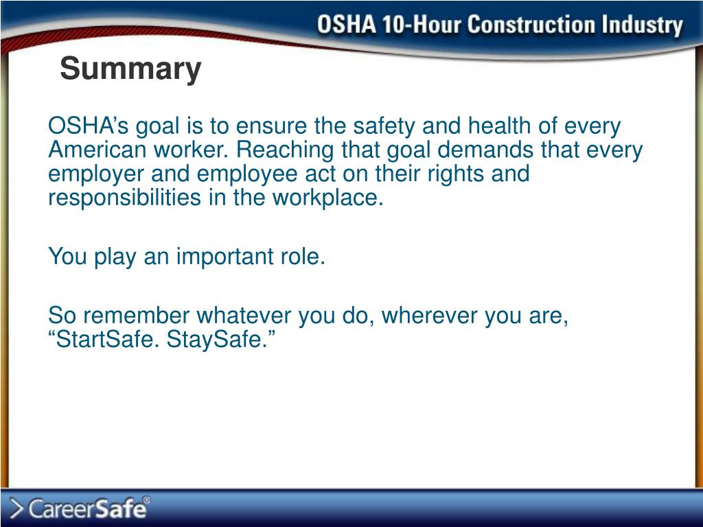 Summary OSHA’s goal is to ensure the safety and health of every American worker. Reaching that goal demands that every employer and employee act on their rights and responsibilities in the workplace. You play an important role. So remember whatever you do, wherever you are, “StartSafe. StaySafe.”