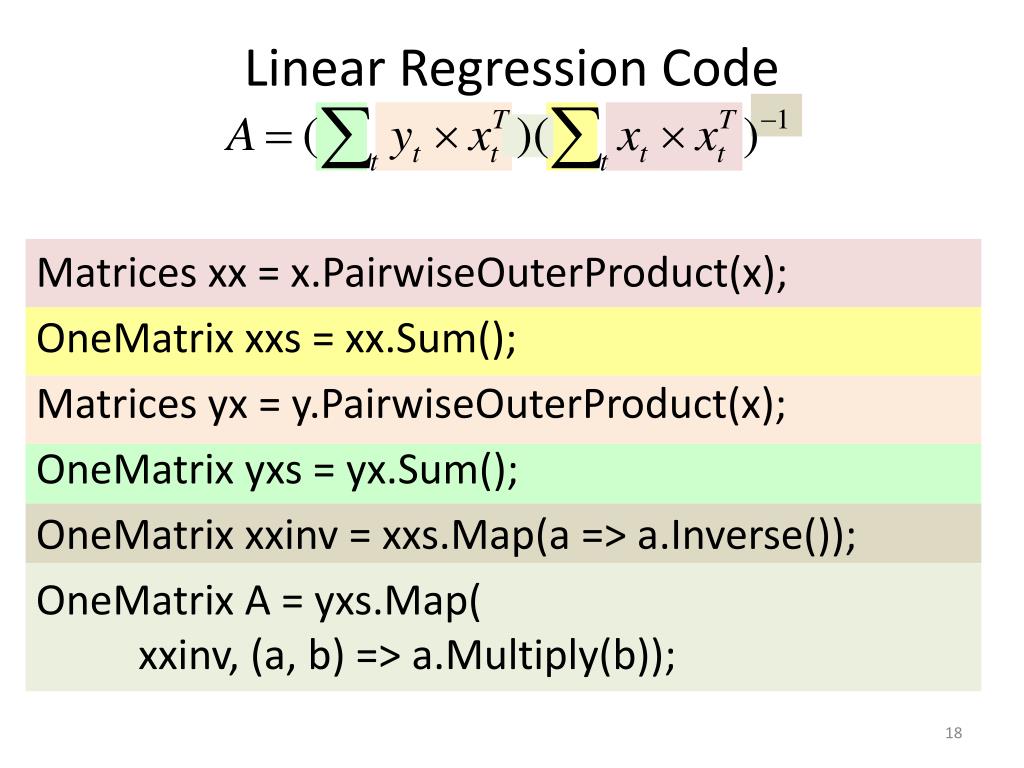 Linear Regression Code Matrices xx = x.PairwiseOuterProduct(x); OneMatrixxxs= xx.Sum(); Matrices yx = y.PairwiseOuterProduct(x); OneMatrixyxs= yx.Sum(); OneMatrixxxinv = xxs.Map(a => a.Inverse()); OneMatrix A = yxs.Map(xxinv, (a, b) => a.Multiply(b));