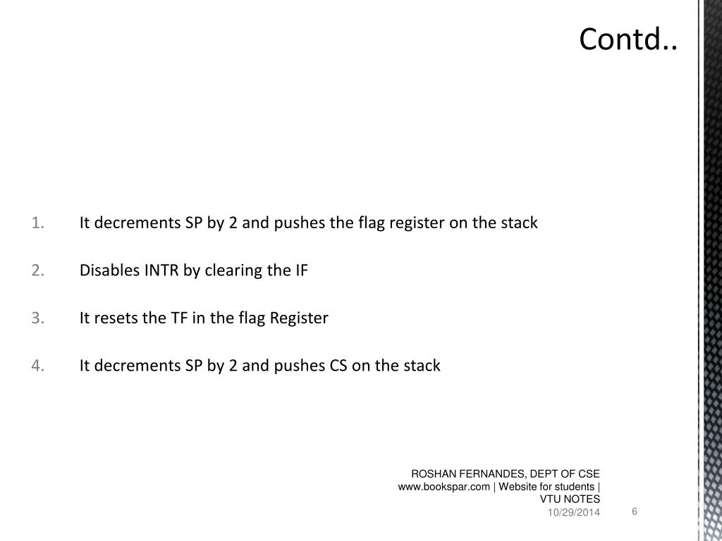 5. It decrements SP by 2 and pushes IP on the stack 6. Fetch the ISR address from the interrupt vector table Contd.. ROSHAN FERNANDES, DEPT OF CSE www.bookspar.com | Website for students | VTU NOTES