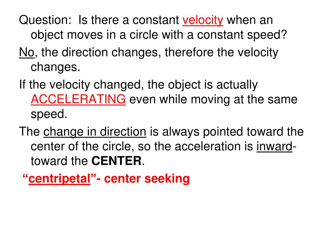 Question: Is there a constant velocity when an object moves in a circle with a constant speed? No, the direction changes, therefore the velocity changes. If the velocity changed, the object is actually ACCELERATING even while moving at the same speed. The change in direction is always pointed toward the center of the circle, so the acceleration is inward- toward the CENTER. “centripetal”- center seeking