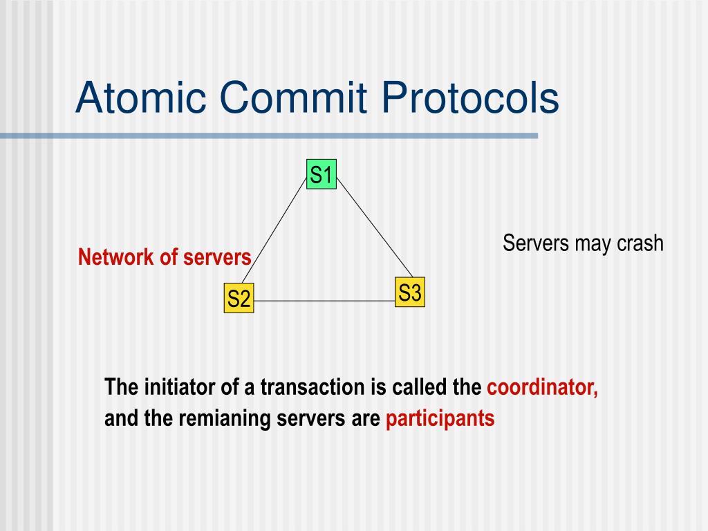 Atomic Commit Protocols Network of servers The initiator of a transaction is called the coordinator, and the remianing servers are participants S1 Servers may crash S3 S2