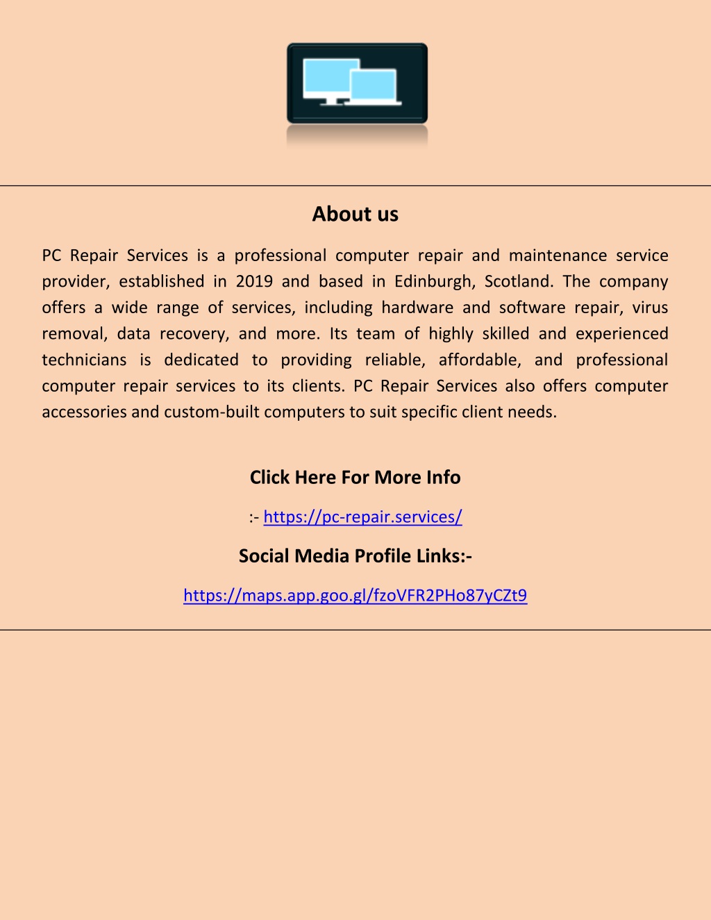 About us PC Repair Services is a professional computer repair and maintenance service provider, established in 2019 and based in Edinburgh, Scotland. The company offers a wide range of services, including hardware and software repair, virus removal, data recovery, and more. Its team of highly skilled and experienced technicians is dedicated to providing reliable, affordable, and professional computer repair services to its clients. PC Repair Services also offers computer accessories and custom-built computers to suit specific client needs. Click Here For More Info :- https://pc-repair.services/ Social Media Profile Links:- https://maps.app.goo.gl/fzoVFR2PHo87yCZt9