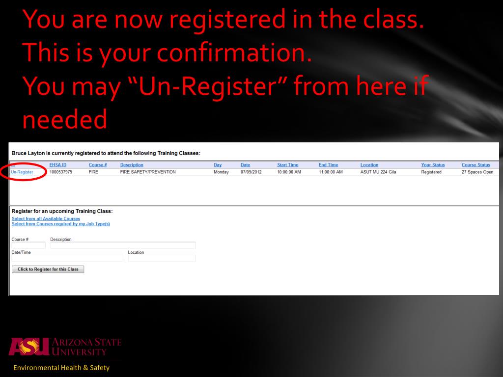 You are now registered in the class.This is your confirmation.You may “Un-Register” from here if needed Environmental Health & Safety