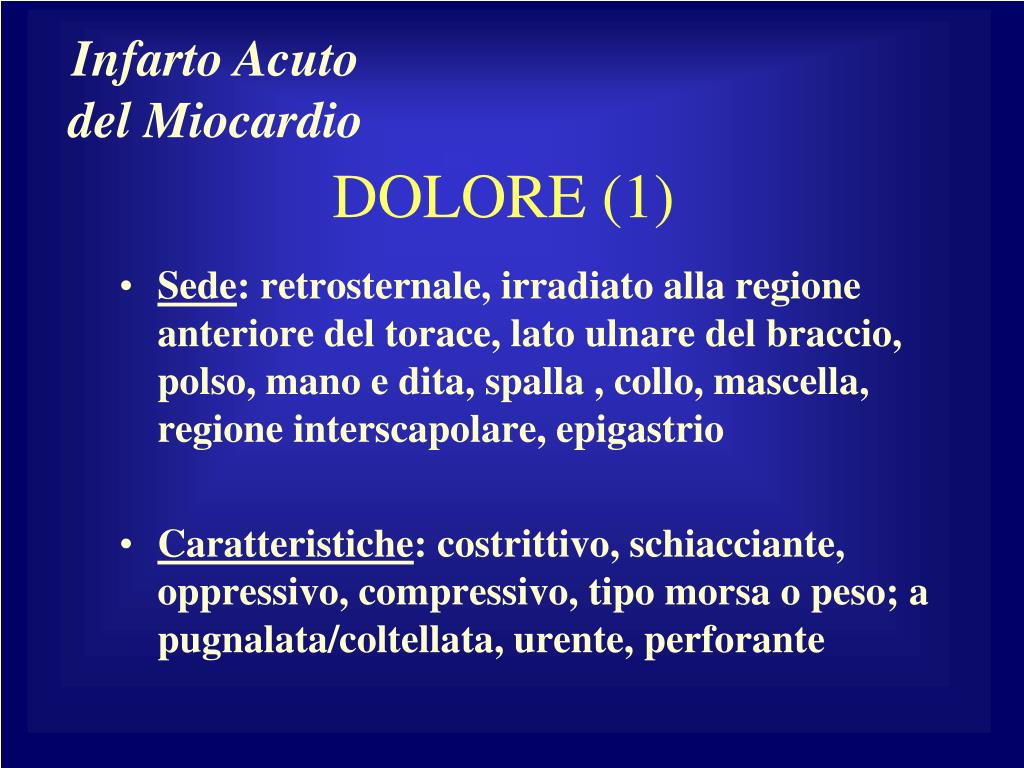 Infarto Acuto del Miocardio DOLORE (1) • Sede: retrosternale, irradiato alla regione anteriore del torace, lato ulnare del braccio, polso, mano e dita, spalla , collo, mascella, regione interscapolare, epigastrio • Caratteristiche: costrittivo, schiacciante, oppressivo, compressivo, tipo morsa o peso; a pugnalata/coltellata, urente, perforante