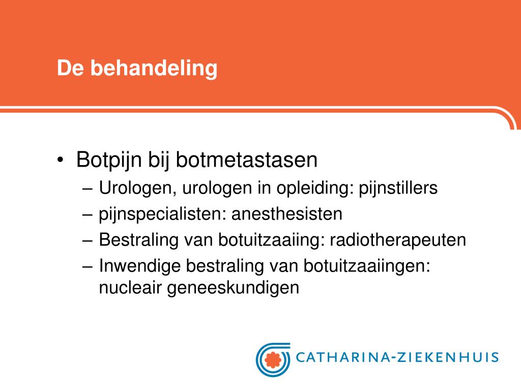 De behandeling • Botpijn bij botmetastasen • Urologen, urologen in opleiding: pijnstillers • pijnspecialisten: anesthesisten • Bestraling van botuitzaaiing: radiotherapeuten • Inwendige bestraling van botuitzaaiingen: nucleair geneeskundigen