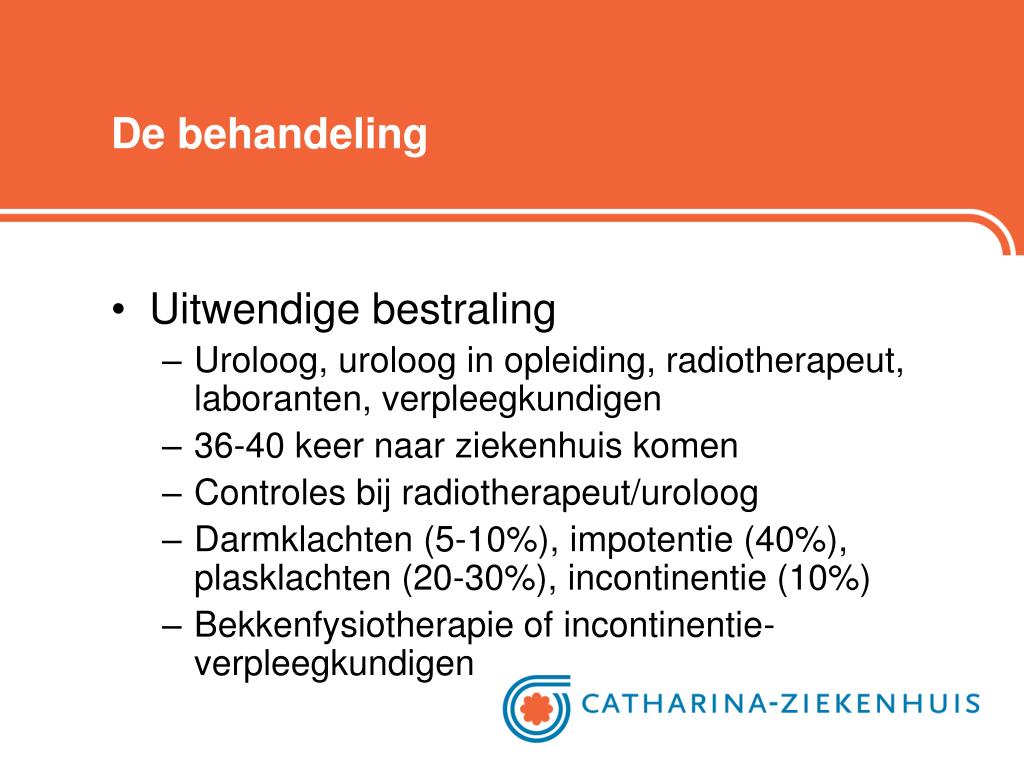 De behandeling • Uitwendige bestraling • Uroloog, uroloog in opleiding, radiotherapeut, laboranten, verpleegkundigen • 36-40 keer naar ziekenhuis komen • Controles bij radiotherapeut/uroloog • Darmklachten (5-10%), impotentie (40%), plasklachten (20-30%), incontinentie (10%) • Bekkenfysiotherapie of incontinentie-verpleegkundigen