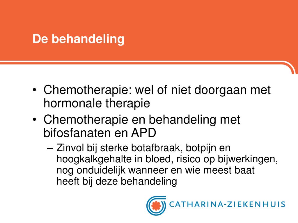 De behandeling • Chemotherapie: wel of niet doorgaan met hormonale therapie • Chemotherapie en behandeling met bifosfanaten en APD • Zinvol bij sterke botafbraak, botpijn en hoogkalkgehalte in bloed, risico op bijwerkingen, nog onduidelijk wanneer en wie meest baat heeft bij deze behandeling