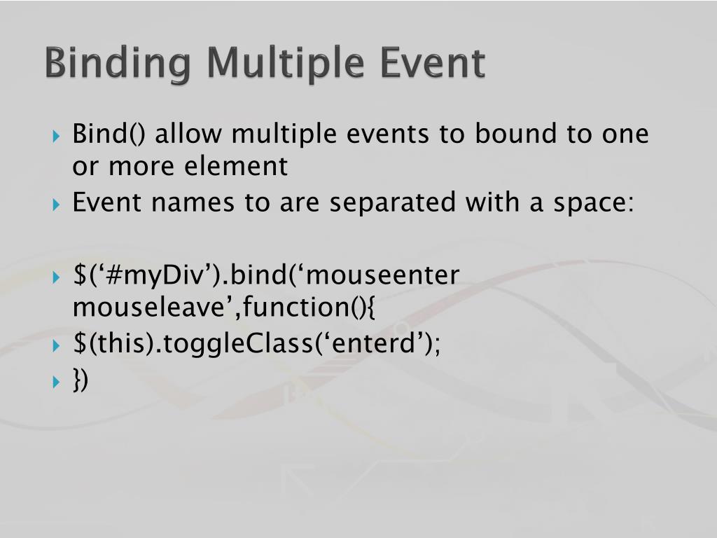 Binding Multiple Event • Bind() allow multiple events to bound to one or more element • Event names to are separated with a space: • $(‘#myDiv’).bind(‘mouseentermouseleave’,function(){ • $(this).toggleClass(‘enterd’); • })