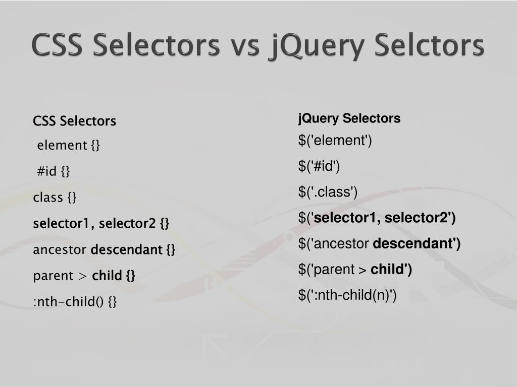 CSS Selectors vsjQuerySelctors CSS Selectors element {} #id {} class {} selector1, selector2 {} ancestor descendant {} parent > child {} :nth-child() {} jQuery Selectors $('element') $('#id') $('.class') $('selector1, selector2') $('ancestor descendant') $('parent > child') $(':nth-child(n)')