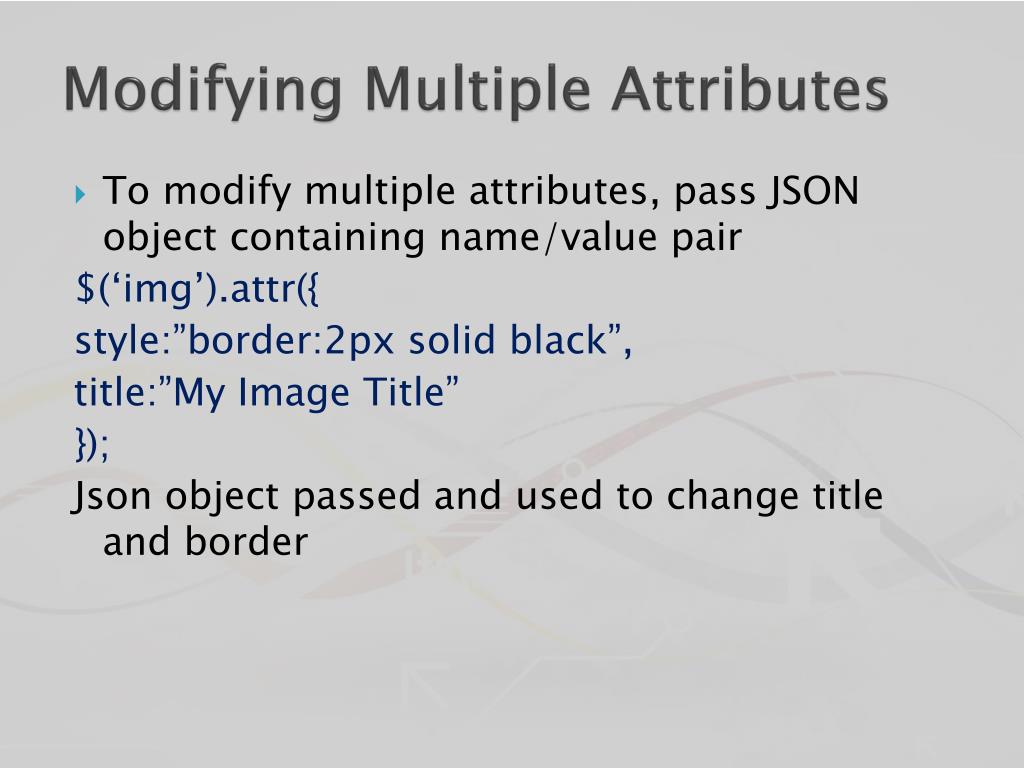 Modifying Multiple Attributes • To modify multiple attributes, pass JSON object containing name/value pair $(‘img’).attr({ style:”border:2px solid black”, title:”My Image Title” }); Json object passed and used to change title and border