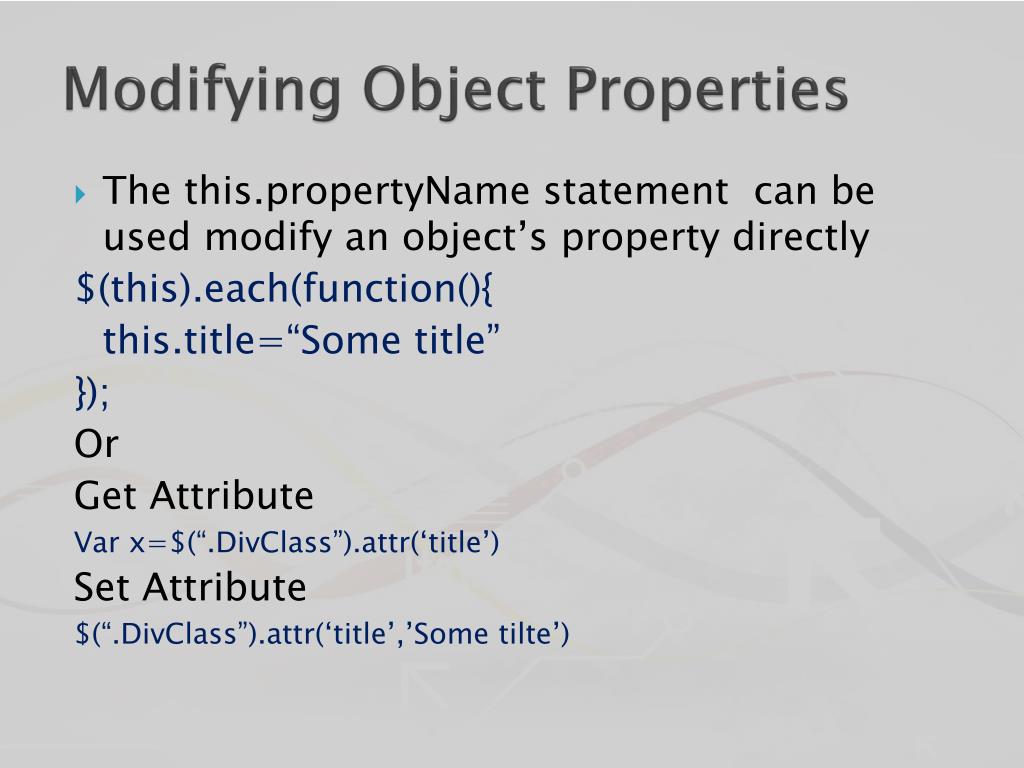 Modifying Object Properties • The this.propertyName statement can be used modify an object’s property directly $(this).each(function(){ this.title=“Some title” }); Or Get Attribute Var x=$(“.DivClass”).attr(‘title’) Set Attribute $(“.DivClass”).attr(‘title’,’Sometilte’)