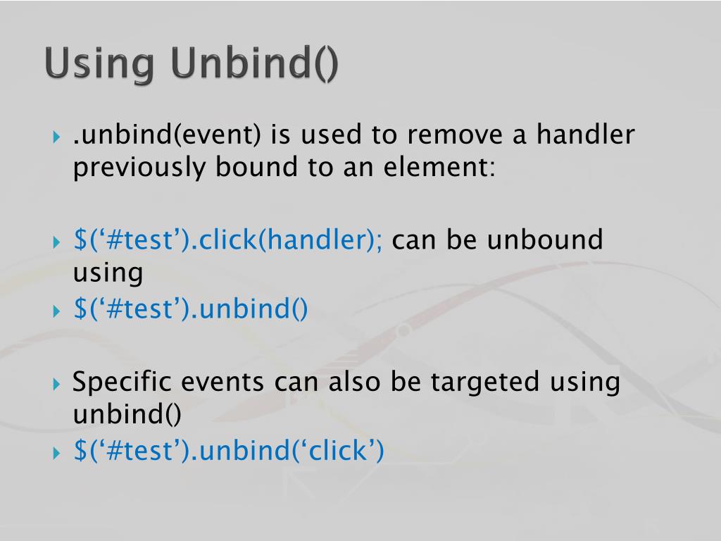 Using Unbind() • .unbind(event) is used to remove a handler previously bound to an element: • $(‘#test’).click(handler); can be unbound using • $(‘#test’).unbind() • Specific events can also be targeted using unbind() • $(‘#test’).unbind(‘click’)