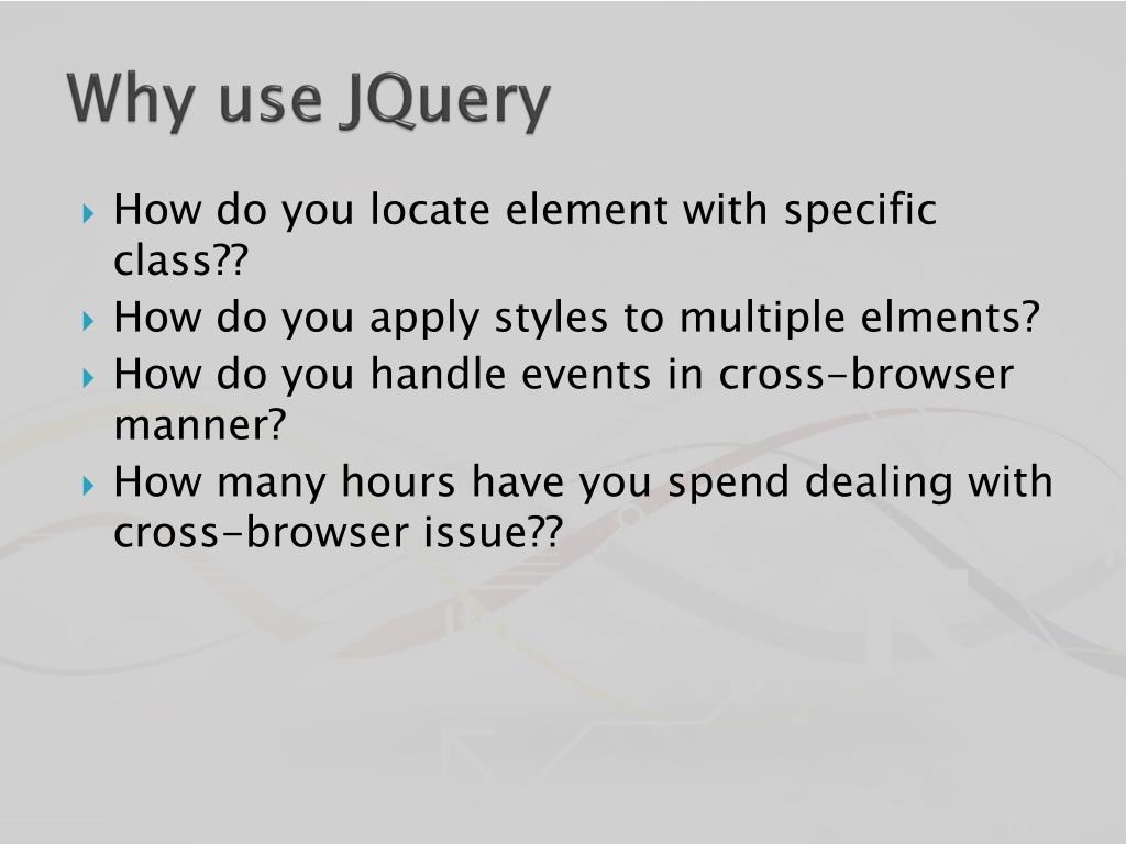 Why use JQuery • How do you locate element with specific class?? • How do you apply styles to multiple elments? • How do you handle events in cross-browser manner? • How many hours have you spend dealing with cross-browser issue??