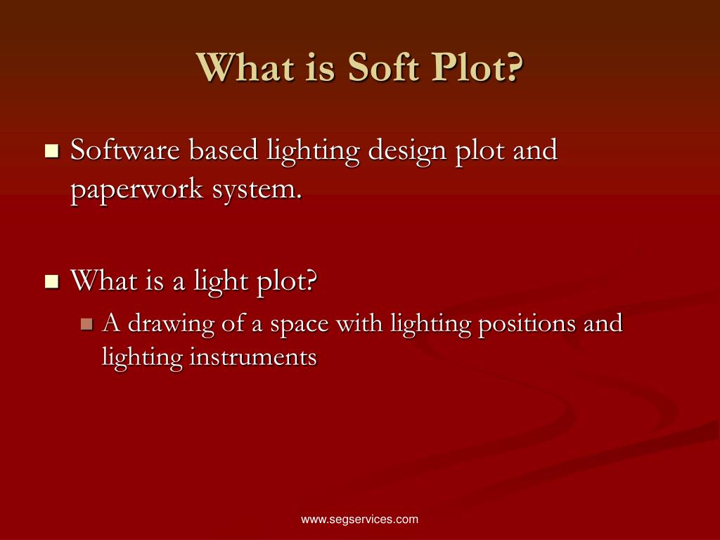 What is Soft Plot? www.segservices.com • Software based lighting design plot and paperwork system. • What is a light plot? • A drawing of a space with lighting positions and lighting instruments