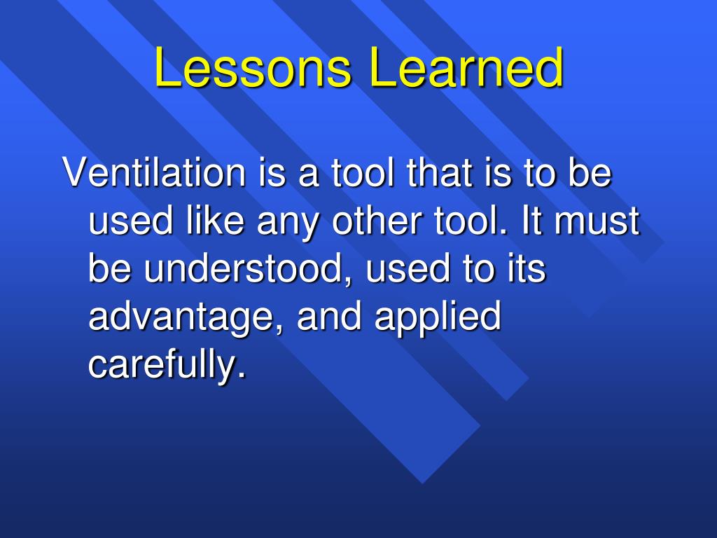 Lessons Learned Ventilation is a tool that is to be used like any other tool. It must be understood, used to its advantage, and applied carefully.
