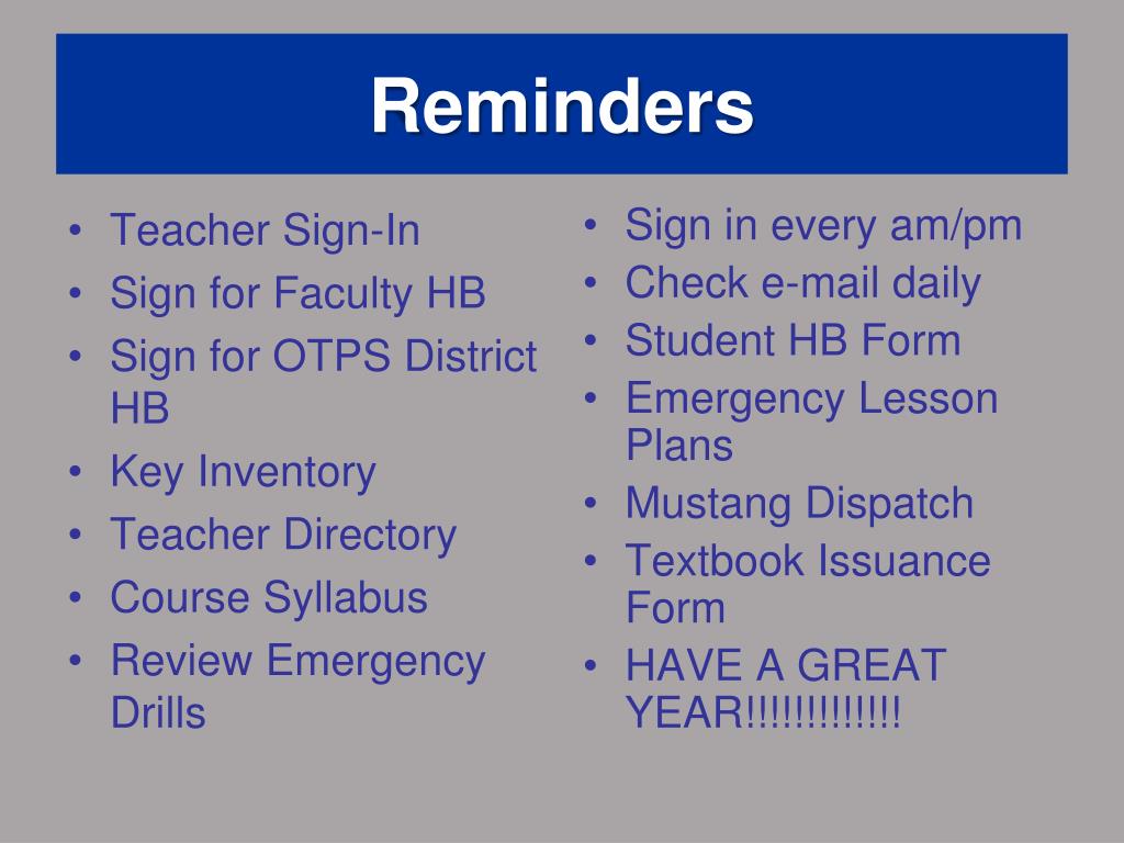 Teacher Sign-In Sign for Faculty HB Sign for OTPS District HB Key Inventory Teacher Directory Course Syllabus Review Emergency Drills Sign in every am/pm Check e-mail daily Student HB Form Emergency Lesson Plans Mustang Dispatch Textbook Issuance Form HAVE A GREAT YEAR!!!!!!!!!!!!! Reminders