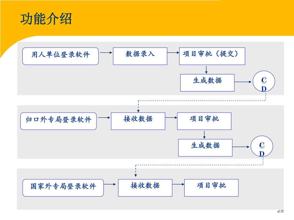 用人单位登录软件 数据录入 项目审批(提交) CD 生成数据 归口外专局登录软件 接收数据 项目审批 CD 生成数据 国家外专局登录软件 接收数据 项目审批 功能介绍