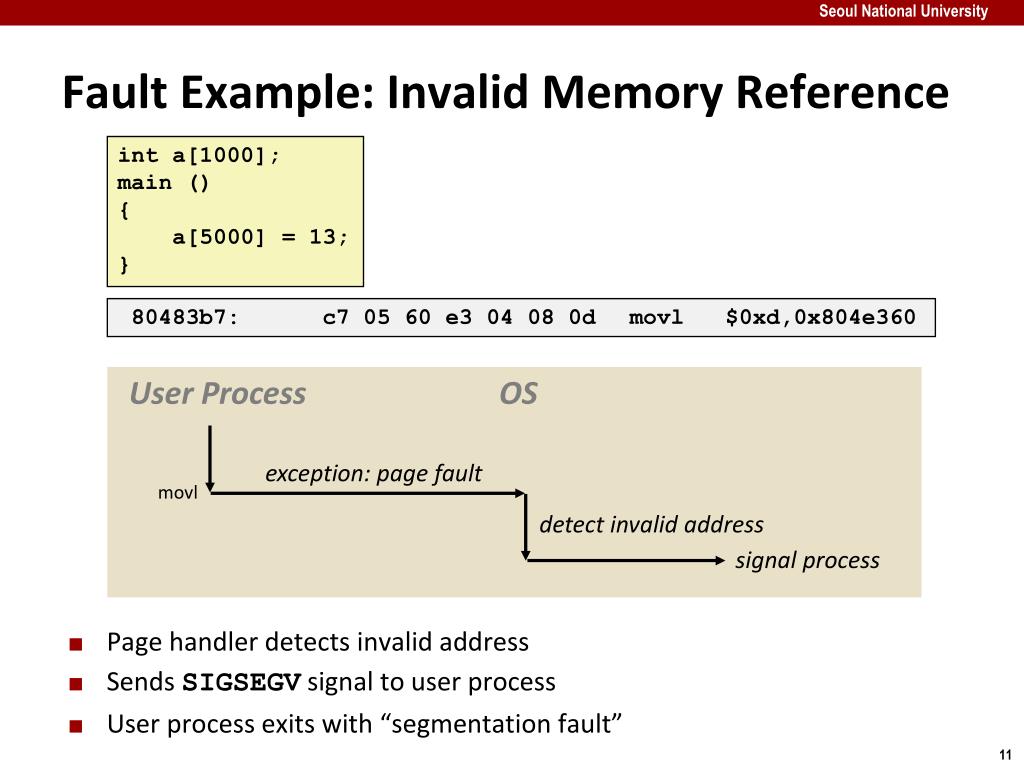 Fault Example: Invalid Memory Reference int a[1000]; main () { a[5000] = 13; } • Page handler detects invalid address • Sends SIGSEGV signal to user process • User process exits with “segmentation fault” 80483b7: c7 05 60 e3 04 08 0d movl $0xd,0x804e360 User Process OS exception: page fault movl detect invalid address signal process