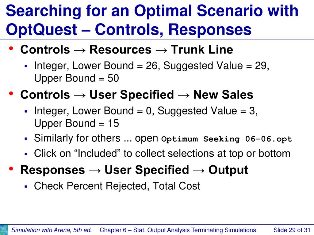 Searching for an Optimal Scenario with OptQuest – Controls, Responses • Controls → Resources → Trunk Line • Integer, Lower Bound = 26, Suggested Value = 29,Upper Bound = 50 • Controls → User Specified → New Sales • Integer, Lower Bound = 0, Suggested Value = 3,Upper Bound = 15 • Similarly for others ... open Optimum Seeking 06-06.opt • Click on “Included” to collect selections at top or bottom • Responses → User Specified → Output • Check Percent Rejected, Total Cost Chapter 6 – Stat. Output Analysis Terminating Simulations