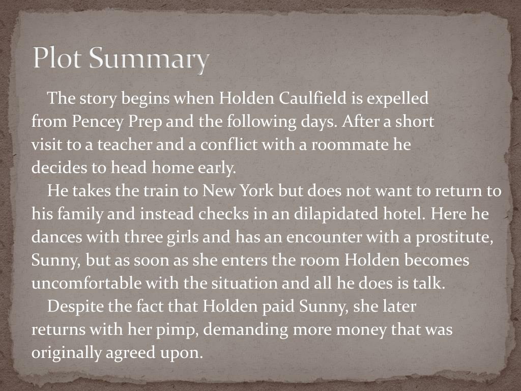 Plot Summary The story begins when Holden Caulfield is expelled from Pencey Prep and the following days. After a short visit to a teacher and a conflict with a roommate he decides to head home early. He takes the train to New York but does not want to return to his family and instead checks in an dilapidated hotel. Here he dances with three girls and has an encounter with a prostitute, Sunny, but as soon as she enters the room Holden becomes uncomfortable with the situation and all he does is talk. Despite the fact that Holden paid Sunny, she later returns with her pimp, demanding more money that was originally agreed upon.